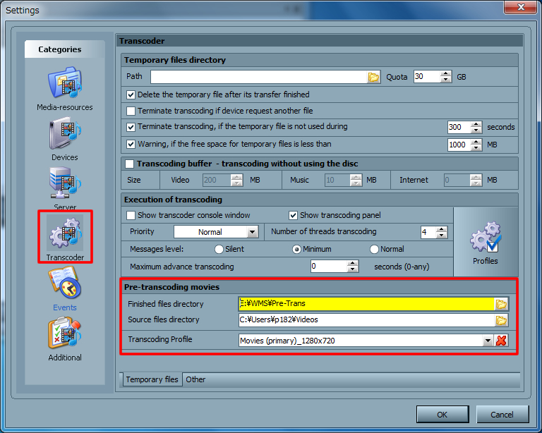 事前トランスコード(Pre-Transcoding)機能を使うには、”Settings”の”Transcoder”内の”Pre-transcoding movies”にトランスコードする元動画が格納されているディレクトリと、変換済みの動画を格納するディレクトリを設定します。