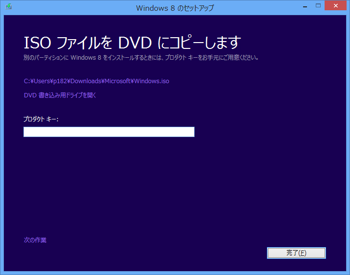 再ダウンロード出来るのか調べてて参考にさせて頂きました。ImgBurnを使わなくても、最後にプロダクトキーが表示された上にある「DVD書き込み用ドライブを開く」からISOファイルをDVD-Rに焼けました。「ディスクイメージ焼き込みツール」ってWindows 7の標準機能なのかな?