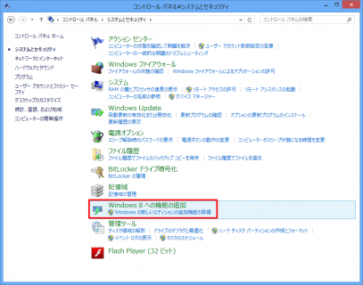 ) + Iキーなどからコントロールパネルを開き、”Windows 8 への機能の追加”をクリック