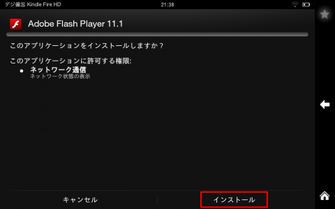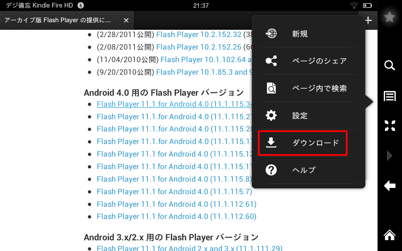 【Kindle Fire HD】から[http://helpx.adobe.com/jp/flash-player/kb/228683.html]にアクセスします。アクセスには標準ブラウザのSilkを利用しました。