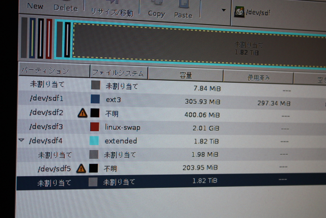 上手くいかなかったので、一旦、dev/sdf5とdev/sdf6の論理パーテーションを削除しています。